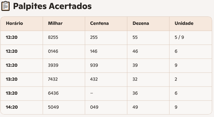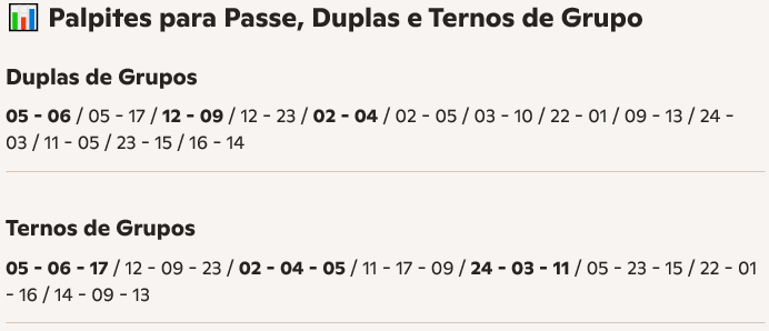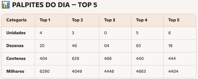 Os palpites são apenas combinações numéricas aleatórias e não garantem acertos em nenhum jogo. Seu uso é pessoal e livre, cabendo a cada jogador decidir como utilizá-los. A loteria legal e regulamentada é a da plataforma Tradicional.bet, que possui certificação oficial e sorteios transparentes.