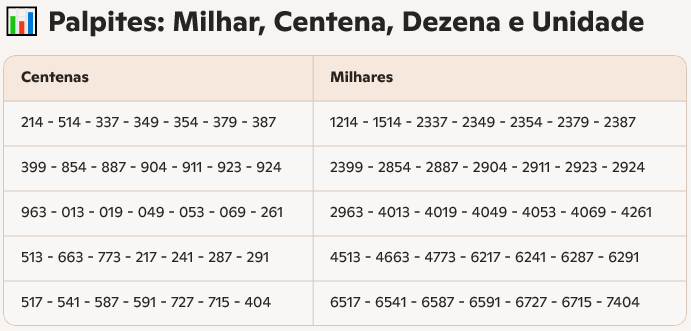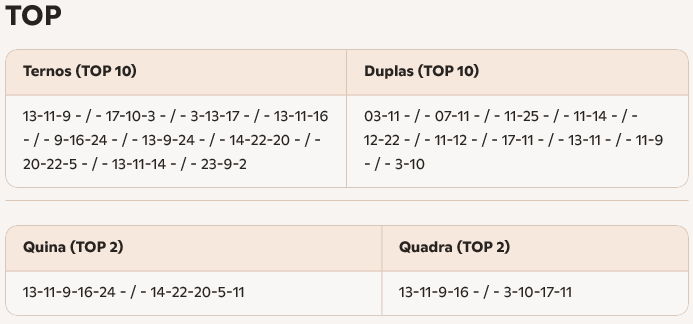 Os palpites são apenas combinações numéricas aleatórias e não garantem acertos em nenhum jogo. Seu uso é pessoal e livre, cabendo a cada jogador decidir como utilizá-los. A loteria legal e regulamentada é a da plataforma Tradicional.bet, que possui certificação oficial e sorteios transparentes.