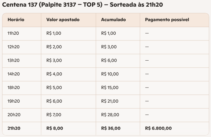 Centena 137 (Palpite 3137 – TOP 5) – Sorteada às 21h20 no 1º prêmio