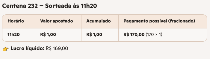 Centena 232 (Palpite 3232) – Sorteada às 11h20 no 5º prêmio – fracionado.
