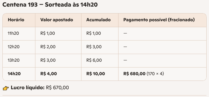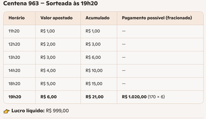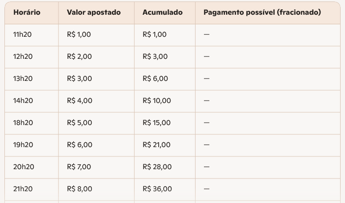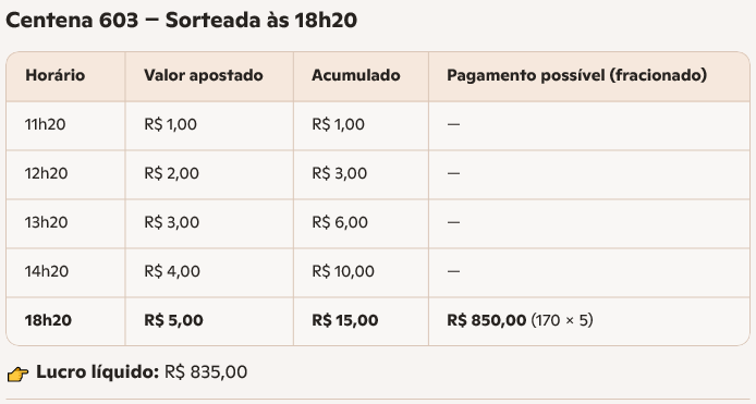 - Mesmo com o pagamento reduzido (R$ 170,00 por R$ 1,00), a progressão garantiu retornos expressivos, multiplicando várias vezes o custo acumulado.