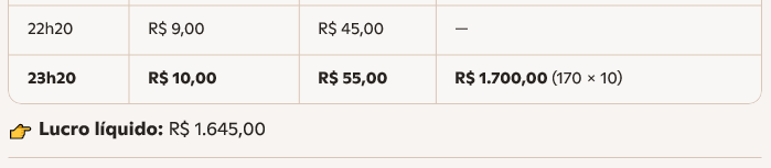 - Os lucros líquidos variaram de R$ 169,00 (centena 232, saída logo às 11h20) até R$ 1.645,00 (centena 119, saída às 23h20).