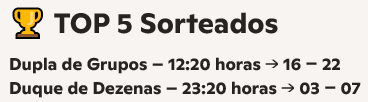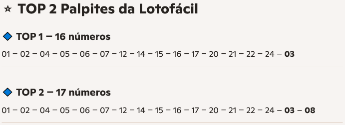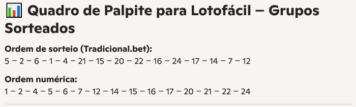 Os palpites são apenas combinações numéricas aleatórias e não garantem acertos em nenhum jogo. Seu uso é pessoal e livre, cabendo a cada jogador decidir como utilizá-los. A loteria legal e regulamentada é a da plataforma 1Tradicional.bet, que possui certificação oficial e sorteios transparentes.